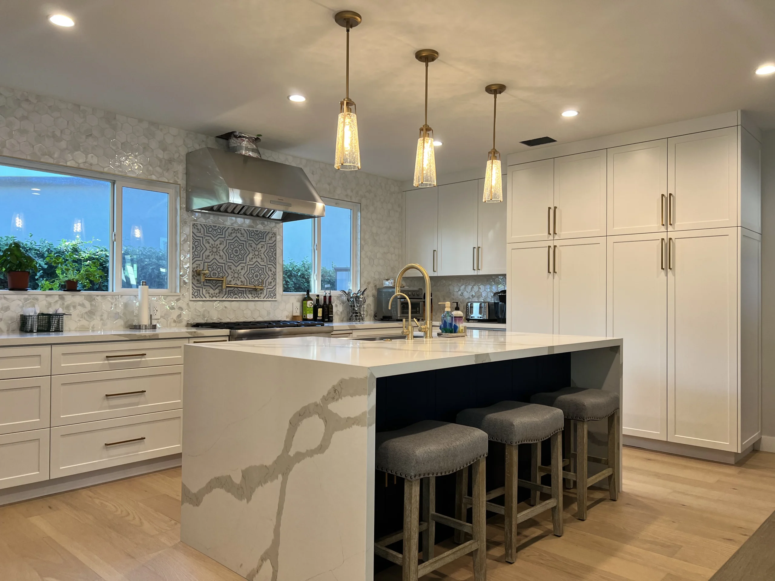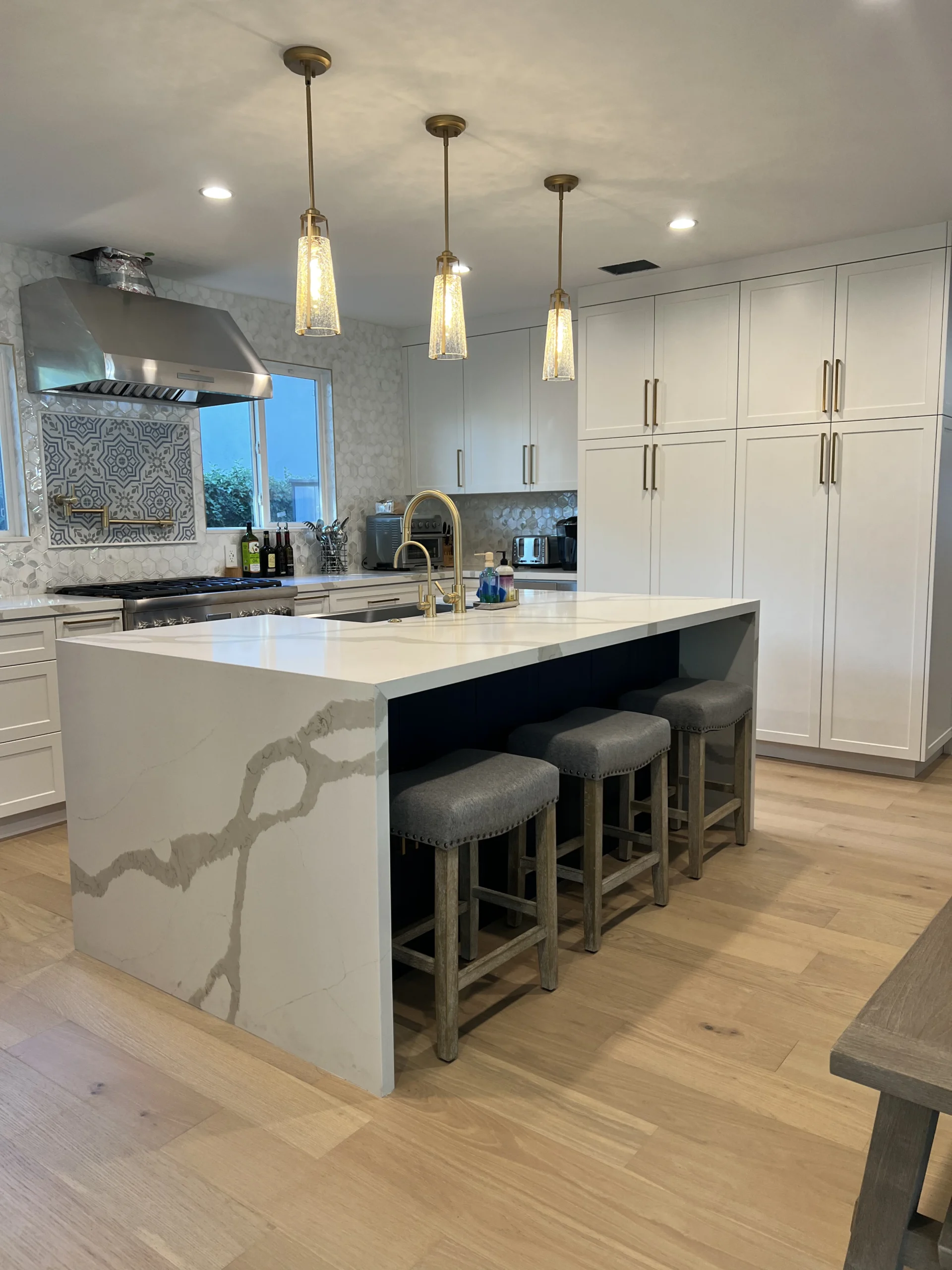 For the Encino residence, the original kitchen was dark and disconnected from the home’s natural flow. Nobel Builders reimagined the space by implementing an open-concept floor plan that allows for a seamless transition into the living area. We installed custom-milled cabinetry with a matte finish, paired with a massive Calacatta quartz waterfall island that serves as the room’s focal point.