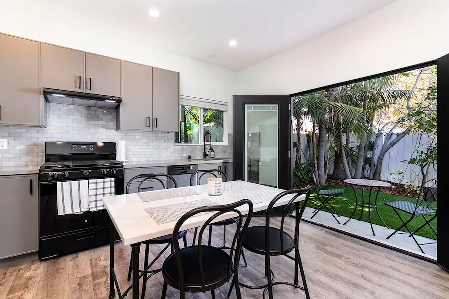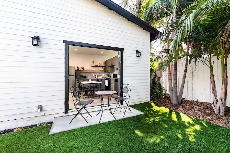 The exterior of the ADU complements the modern design, with a stylish combination of materials, including clean white walls and contrasting black trim. The addition of a small outdoor seating area, visible in the images, creates a cozy space for dining or unwinding, perfect for the temperate climate of Woodland Hills.